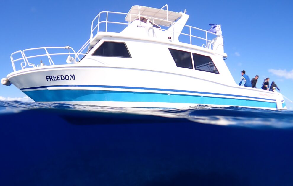 はいさーい!相変わらず窒素は溜まってもお金は貯まらないコーキでーす(^^)/ 今日はファンダイビング&シュノーケリングで透視度抜群の海へGO~☆彡水中から見上げる空は、まるで天然の万華鏡!ゆらゆら揺れる雲と太陽が「スネルの窓」に収まり、ダイバーだけの特権的な景色に。新春の澄んだ光が水底まで差し込み、最高のダイビング日和~ 気温23℃ 水温22℃ 東の風 晴れ 【桜口アウトリーフ】透視度30m 愛船「FREEDOM号」と青い空!
