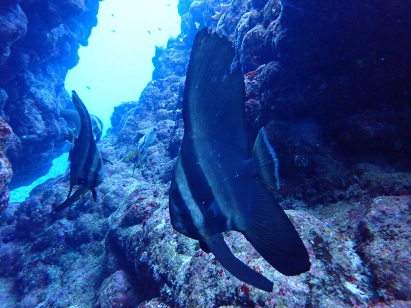 洞窟の出口で待ち構えていたのは、大きな「ツバメウオ」たち