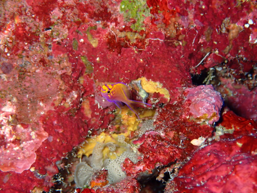 赤い岩肌に映える、鮮やかな紫色の「ハナゴンベイビー」潮の流れに乗って舞い踊る姿は、水中のお花見状態!群れで泳ぐ彼らの色彩は、ライトを当てるとさらに輝きを増し光に反応して、紫やオレンジの体色が爆発するように輝いてめちゃ綺麗 紫の縁取りが美しい「ゾウゲイロウミウシ」