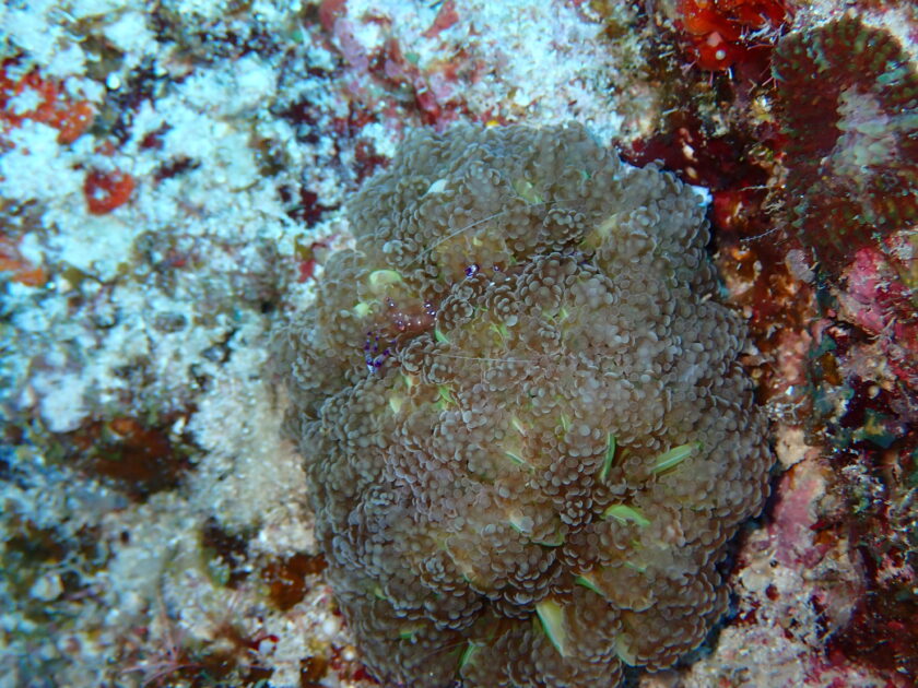 トゲトゲが密集する中に、アカイバラウミウシが隠れています。見つけた時の快感は、まさに水中宝探し!ピントを合わせるのに苦労しましたが、その分愛着がわくキュートな姿です。 透明なナデシコカクレエビ