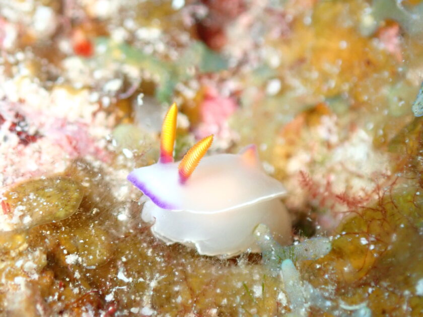 トゲトゲが密集する中に、アカイバラウミウシが隠れています。見つけた時の快感は、まさに水中宝探し!ピントを合わせるのに苦労しましたが、その分愛着がわくキュートな姿です。