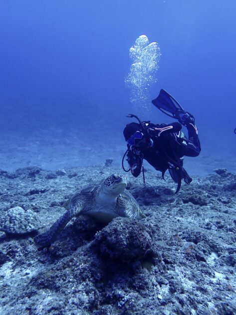 水底で休憩中のアオウミガメに、ダイバーがそっと接近。カメも「あ、また来たの?」と言いたげな表情でリラックスしています。お互いの信頼関係が感じられる、ダイビングの醍醐味が詰まった感動のワンシーン!