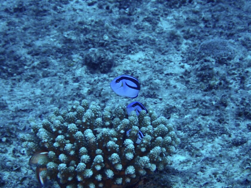 サンゴの隙間を隠れ家にするナンヨウハギは映画でお馴染みの“ドリー”そのもの!鮮やかな青と黒のラインが、サンゴに映える!