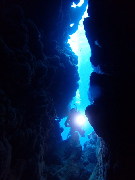 冒険気分で洞窟の中へライトの光のその先には ◆逆さまで泳ぐ小魚たち