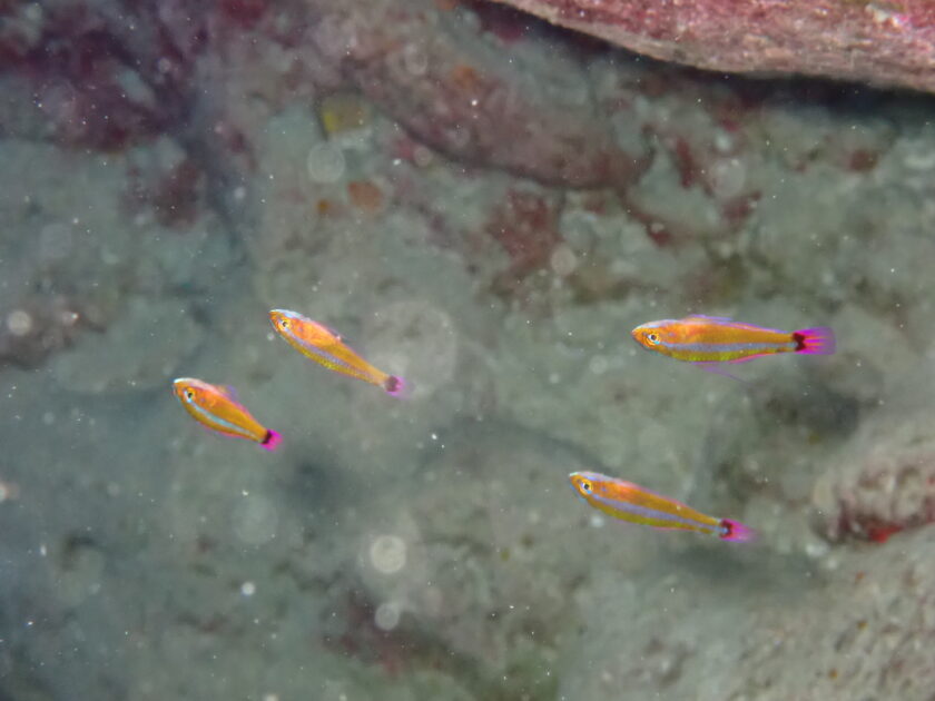 上向きなのか逆さまなのか岩肌にお腹を向けてるのか不思議な泳ぎ方のアオギハゼ
