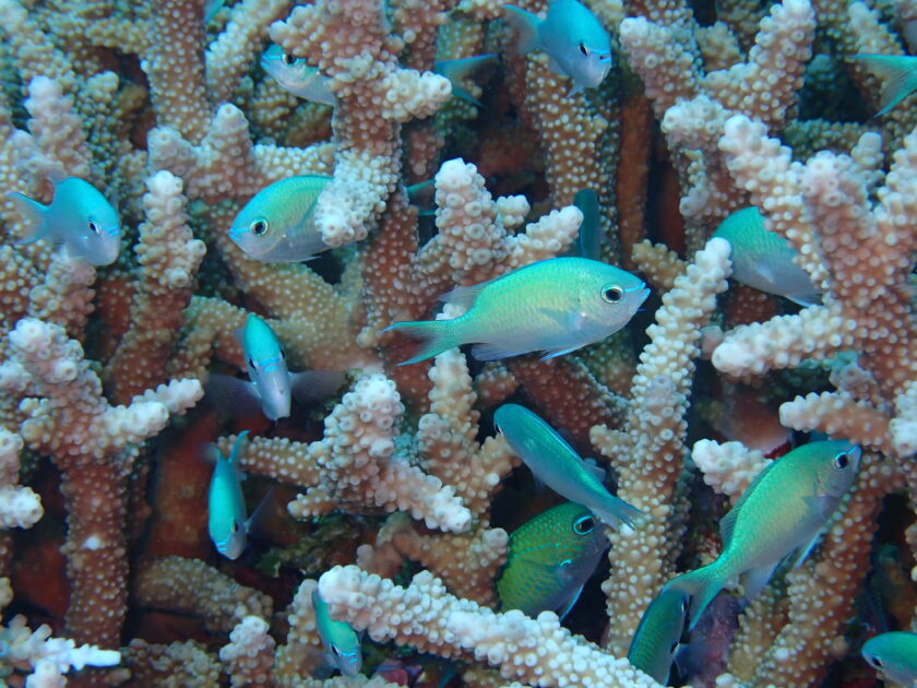 周辺の枝サンゴではデバスズメダイや