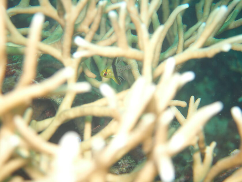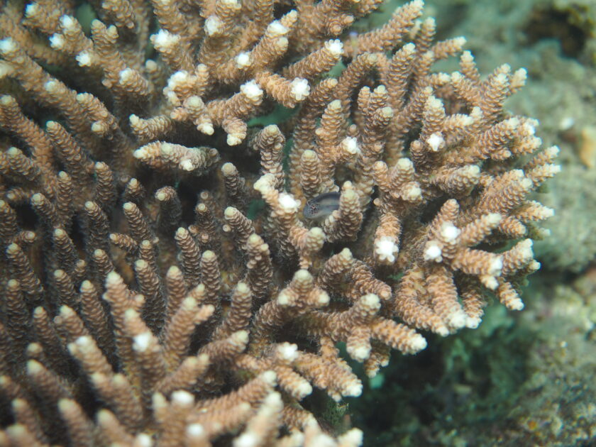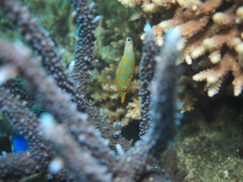 エダサンゴ類の間をテングカワハギが逆立ち泳ぎ