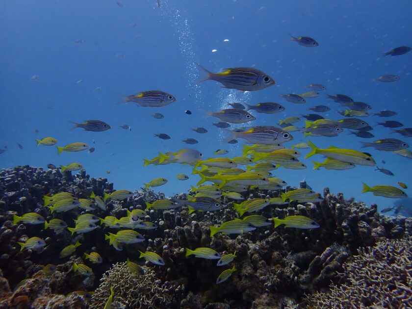 コモンシコロサンゴにはヨスジフエダイ&ノコギリダイ&ウケグチイットウダイ&デバスズメダイたちが群れ