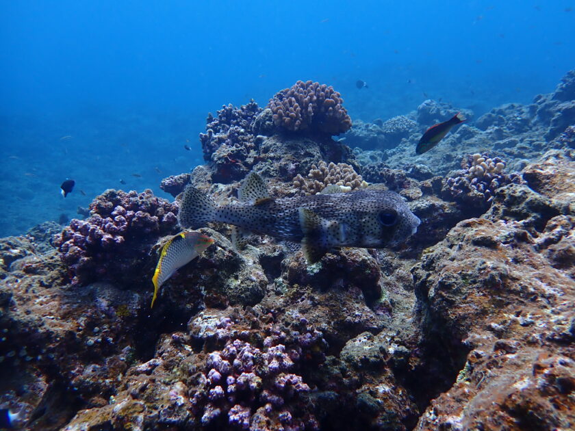 サンゴの上で一休みしていたメガネゴンベは名前の通り、目の周りのオレンジ色の模様がメガネをかけてるみたいでしょ?この「ちょこん」と座ってる姿がたまらん!