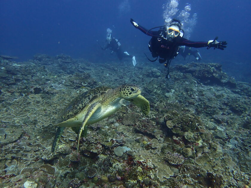 はいさーい!相変わらず窒素は溜まってもお金は貯まらないコーキでーす(^^)/ハッピーハロウィンの今日はファンダイビング&体験ダイビング&シュノーケリングで宮良湾の海へGO~☆彡 気温29℃ 水温27℃ 北の風 曇り時々晴れ 【宮良湾カメパラ】透視度20m default ワーイ!アオウミガメとランデブー