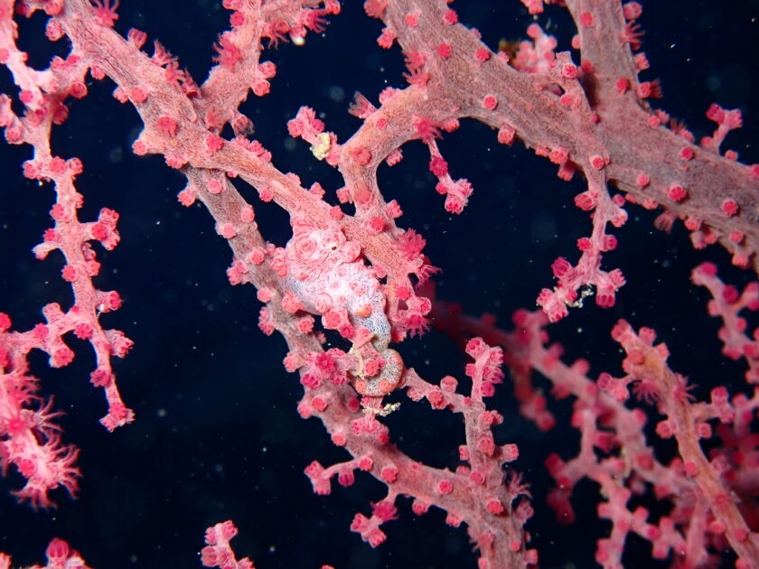 ピンクのウミウチワをじーっくり探すとマクロ好きにはたまらないピグミーシーホース(和名はコダマタツ)の登場です!ポリプにそっくりすぎて完璧すぎる擬態っぷりでした!