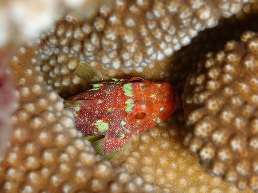 ヘラジカハナヤサイサンゴには蛍光色が綺麗なカスリフサカサゴが住んでましたよ!