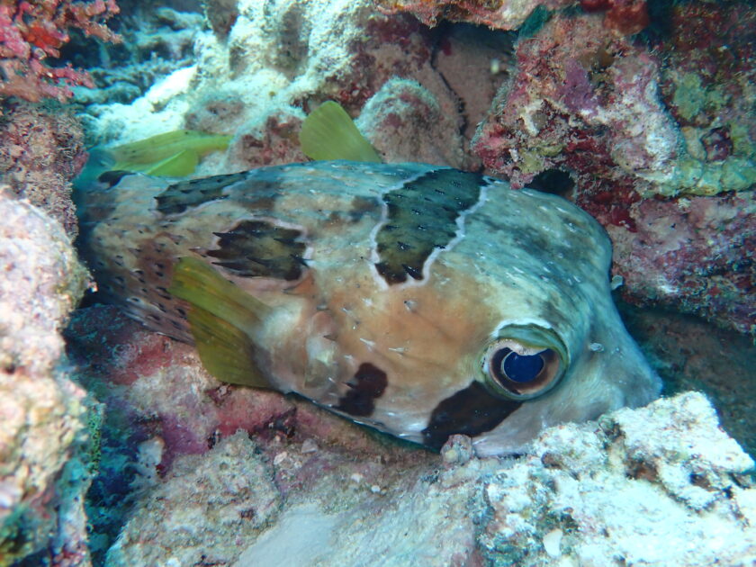 サンゴの隙間に大きなヒトヅラハリセンボンが隠れてました!