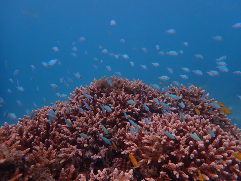 新たに開拓したニューポイントではサンゴにデバスズメダイたちが群れ