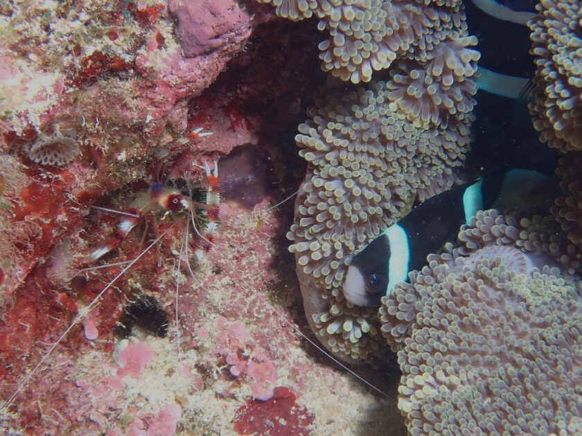 はいさーい!相変わらず窒素は溜まってもお金は貯まらないコーキでーす(^^)/ 今日はファンダイビング&体験ダイブで離島の海へGO~☆彡リピーターさんも初来店の方も交えて、賑やかに出港!狙うはもちろんマンタポイント。果たして結果は…?今日のハイライトをお届けしまーす! 気温25℃ 水温22℃ 北東の風やや強く 晴れ 【黒島タートルリーフ/V字ドロップ】透視度15~20m 異種間交流!クマノミとオトヒメエビのツーショット