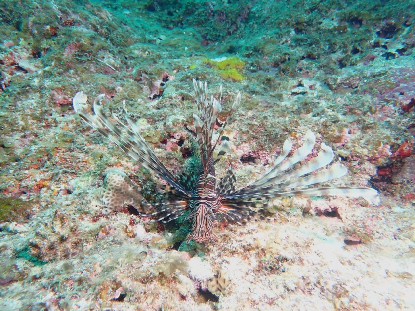 ゆったりと泳いで獲物を追い込むハンターでもあります。その美しい縞模様は、ヒレには強い毒がありますよー近づいちゃダメですよーって危険の警告色。自然が作り出したデザインの妙に、思わず見惚れてしまいますね!