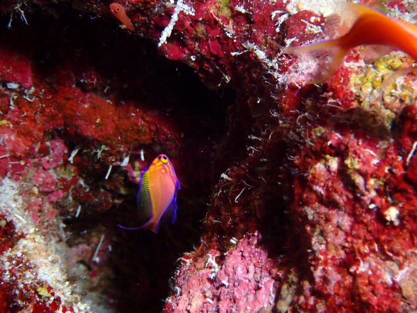 暗がりをパッと明るく照らすような、鮮やかなハナダイの仲間ハナゴンベbaby♡を発見!紫から黄色へのグラデーションが芸術的で岩の隙間をちょこまかと動く姿は、まるで海の宝石がダンスしているみたい!