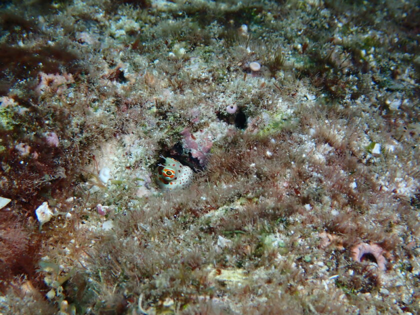 このとぼけた表情と、赤い水玉模様がたまらなく可愛いぃぃこちらの様子を伺っているようで、目が合うと思わず笑っちゃいます!クリクリとした大きな目と愛嬌のある顔立ちは、マクロ派ダイバーのアイドルで岩肌のコケをハムハムと食べる姿は、いつまで見ていても飽きないですね!