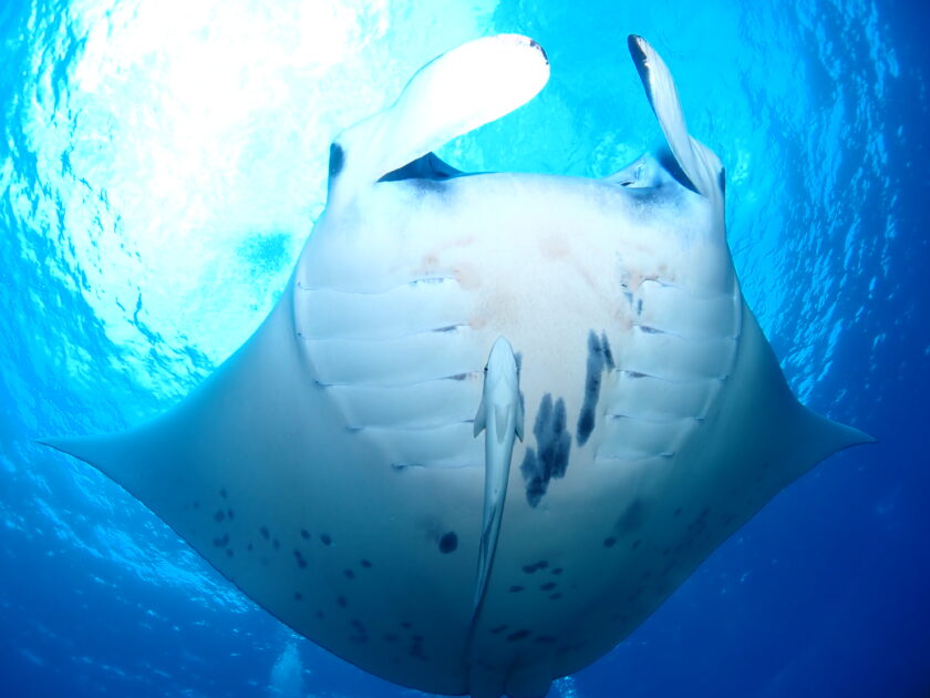 お腹にある黒い斑点は個体識別のID代わりなんですよ。よく見ると、お腹にコバンザメがピッタリくっついています。「タダ乗り楽ちん♪」なんて声が聞こえてきそう(笑)。 最後は、ダイバーたちの頭上を悠々と通り過ぎるマンタ様