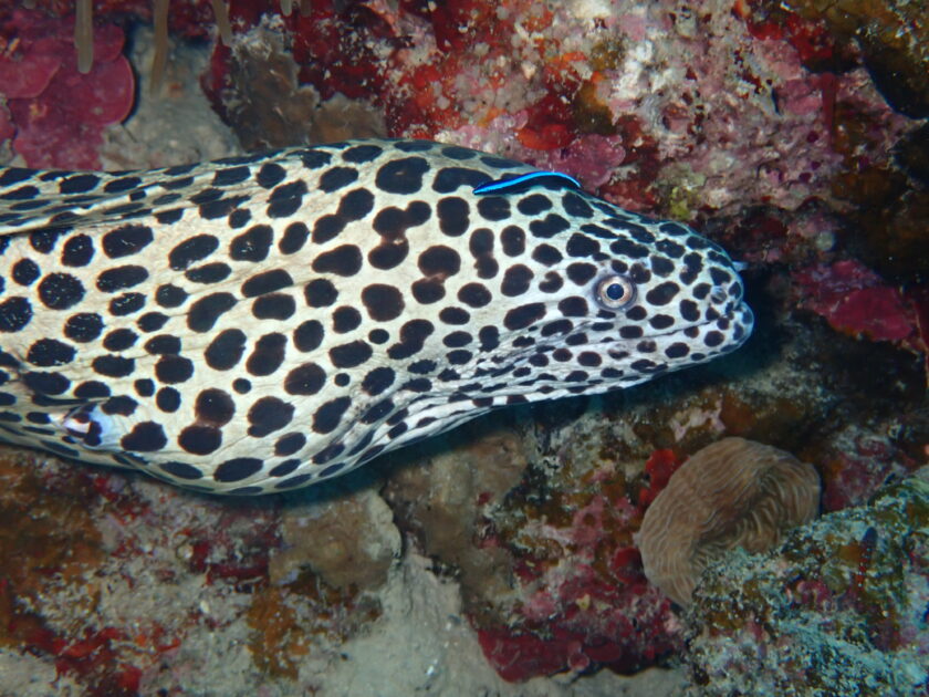 大きなニセゴイシウツボがホンソメワケベラbabyのクリーニング中