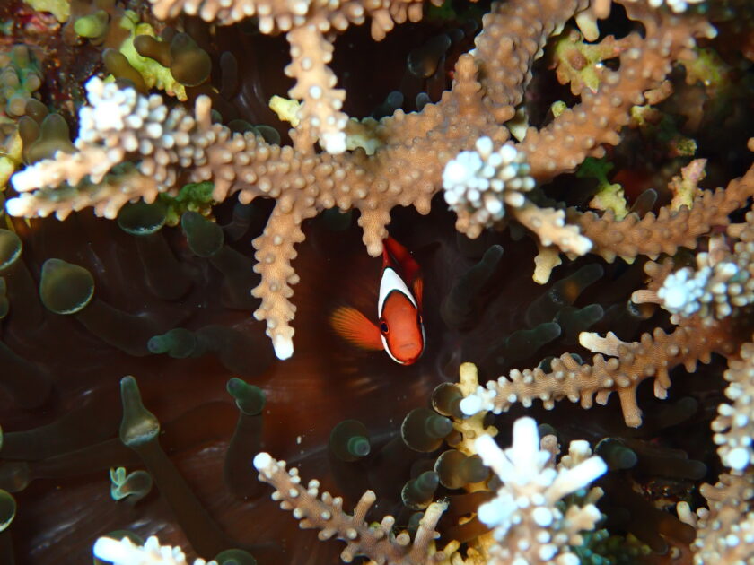 カラフルサンゴの楽園には数種のスズメダイが賑わい