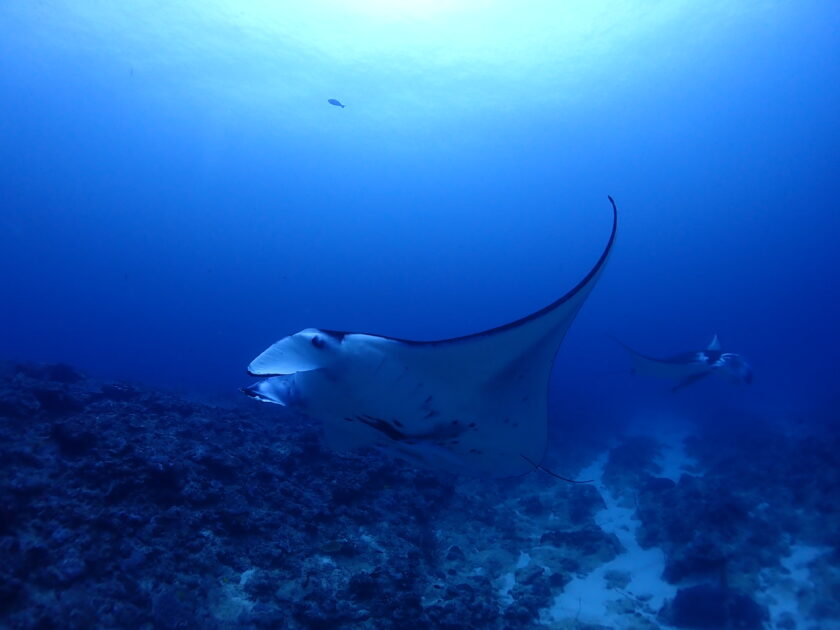 ヨナラ水道のドリフトでは、こうしたマンタに出会えるチャンスが多いんです。マンタはクリーニングフィッシュに寄生虫を取ってもらうために、特定の根に留まります。列を作って順番待ちをするような仕草も見られ、彼らの社会性が垣間見える瞬間。潮流に乗りながら、この巨大な2枚をじっくり観察できるのは、ここ南ぬ島の海ならではの特権ですね。 頭上を通り過ぎるマンタ