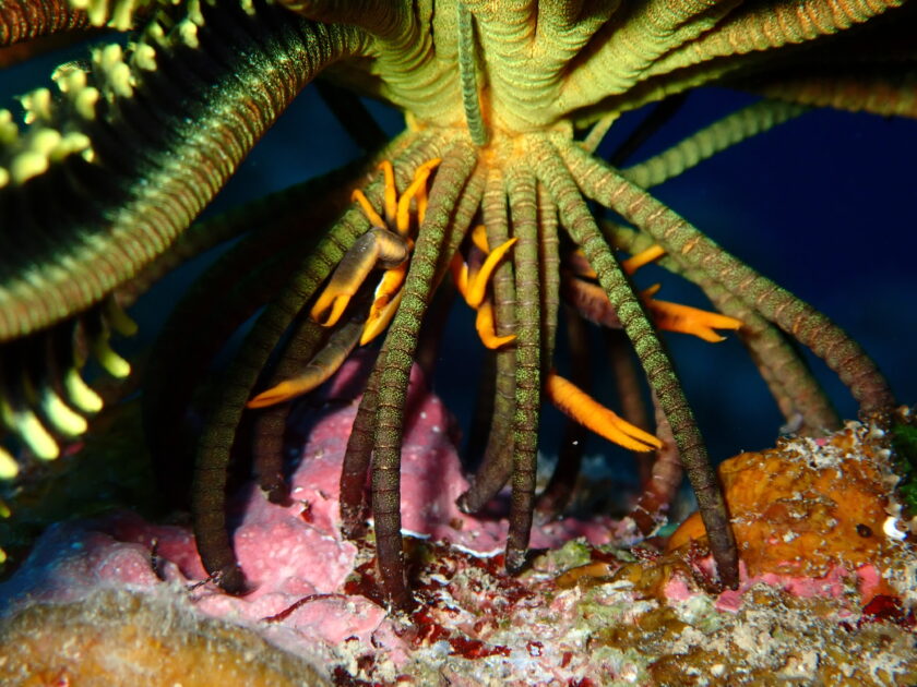 ウミシダに住むペアのコマチコシオリエビ 午前中は全くマンタの気配がなく今日は会えないかなぁと 思いながら水面を散策していると