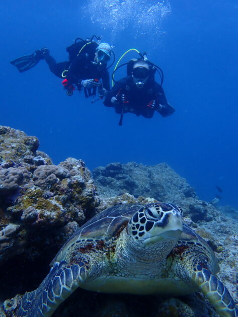 水底でリラックスするカメさんを、ダイバーが上空からそっと見守ります。石垣島ならではの贅沢な距離感に、皆さん大満足の様子でした。