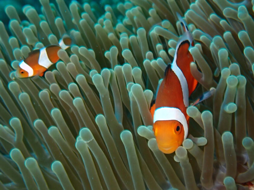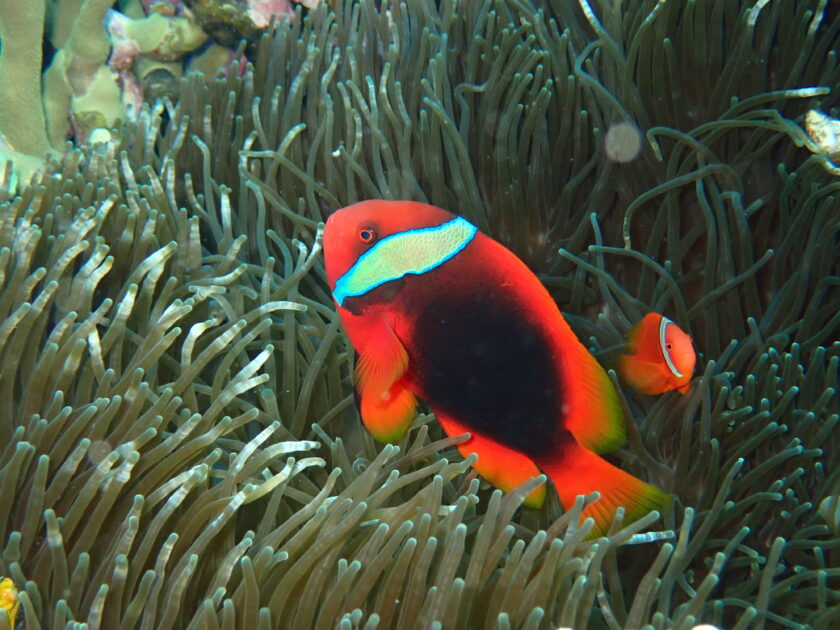 イソギンチャクを住処に、縄張りを守る勇敢な姿が見られました。赤い体が青い海に映えて、まるで水中のお花のようでとっても綺麗!