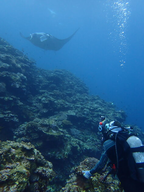 決定的瞬間を逃さないぞ!マンタの大きな体をファインダー越しに追いかけます。野生の迫力を間近で感じながらシャッターを切る瞬間は、ダイバーにとって至福のひとときです!