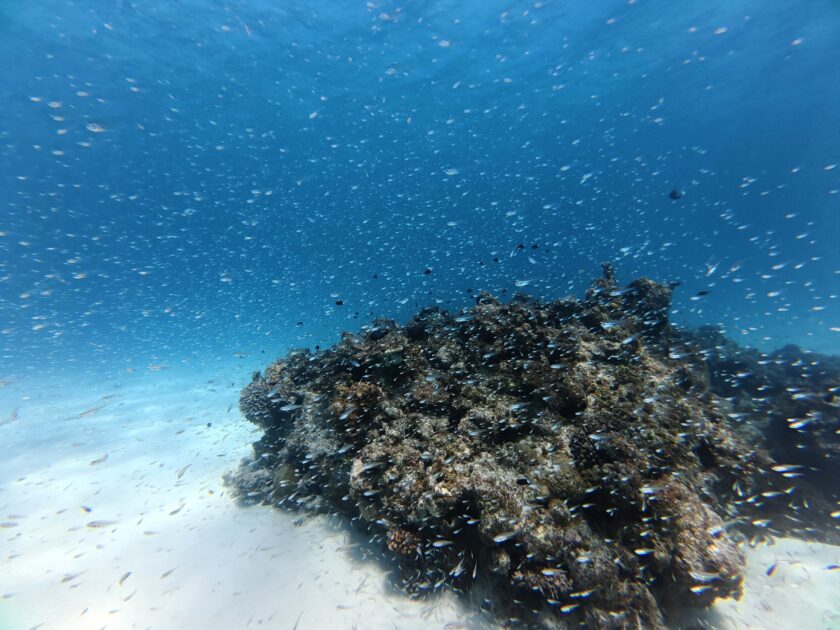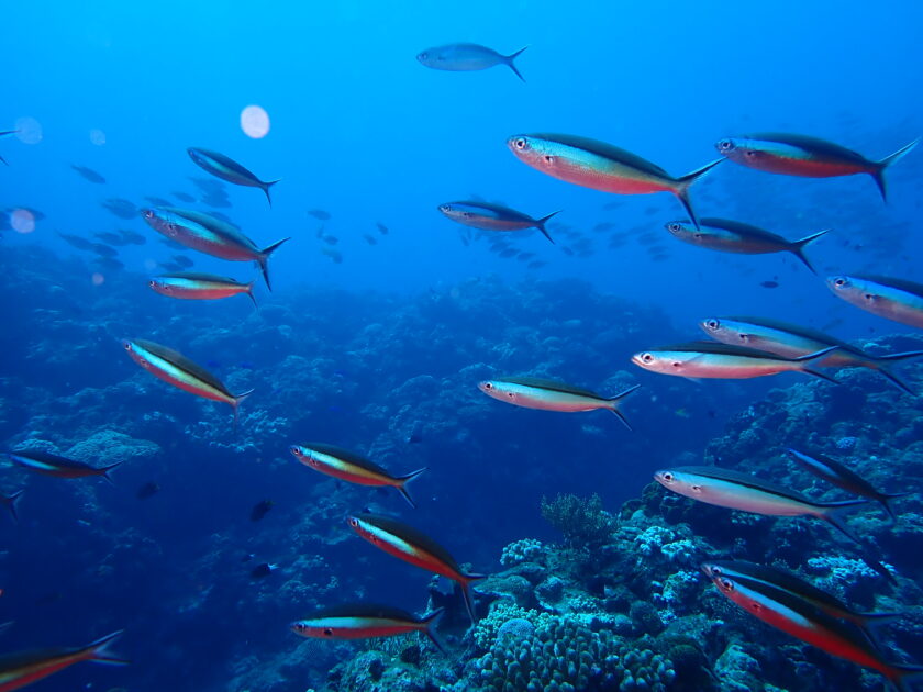 クマササハナムロやササムロ、ウメイロモドキなどのグルクンやノコギリダイ、ヨスジフエダイの群れ群れ