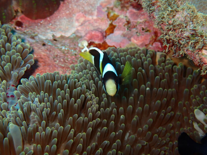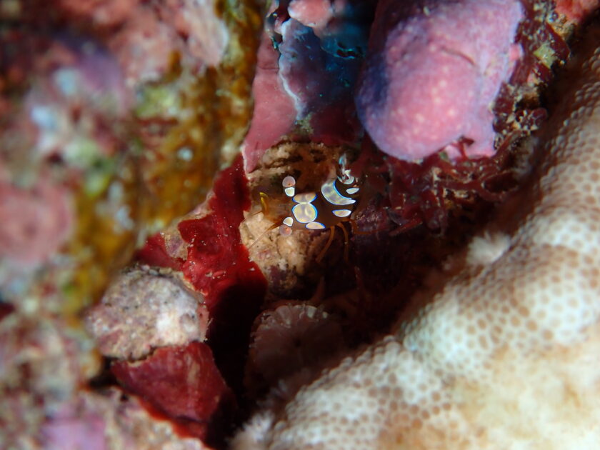 シャチホコにように尾びれを上げてフリフリなイソギンチャクモエビ 【宮良湾ドロップ】透視度20~25m