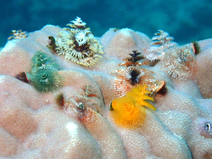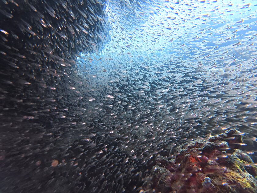 ハマサンゴの隙間にはギッシリとクロスジスカシテンジクダイ!