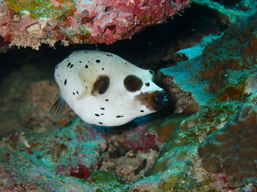 別名「ドッグフェイス」とも呼ばれるコクテンフグは犬みたいなトボけた表情がたまらなくキュートで、ダイバーに大人気の癒やしキャラ!