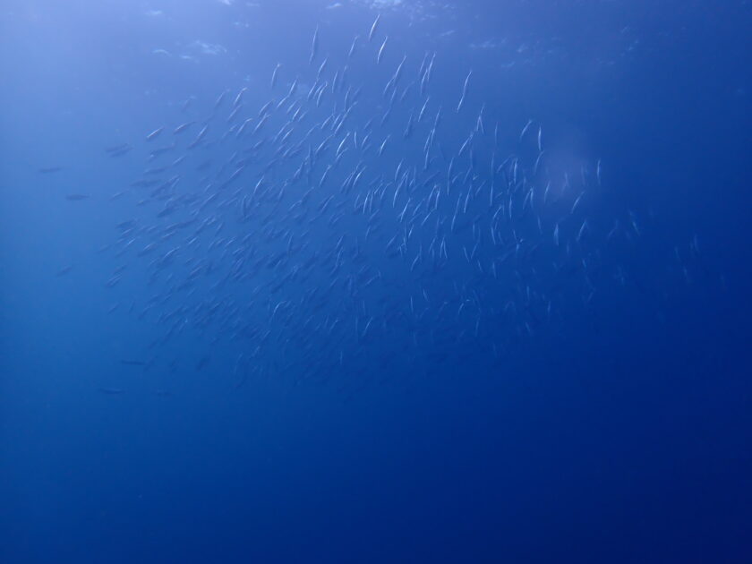 見上げれば一面のグルクン(タカサゴ)の群れ!青い海にキラキラ光る鱗が溶け込んで、まるで天然のプラネタリウムの中にいるみたいな没入感!