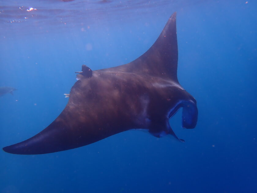 ここでまさかのナンヨウマンタ降臨!コバンザメを連れて悠々と泳ぐ姿は、まさに海の王者。こんなに近くで見られるなんて最高~