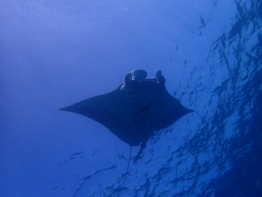 上を見上げるとマンタのシルエット!太陽の光をバックに舞う姿は、まるで海の中を飛ぶ鳥のようでした!