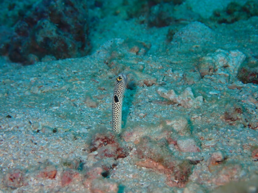 砂地からはチンアナゴたちが流れてくるごはんを求めて、みんな同じ方向を向いてゆらゆら!