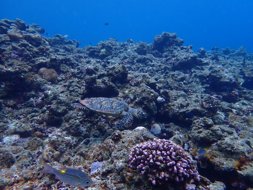 サンゴの隙間で休憩中のタイマイ発見。ギザギザの甲羅と尖ったお口がチャームポイントのウミガメさん