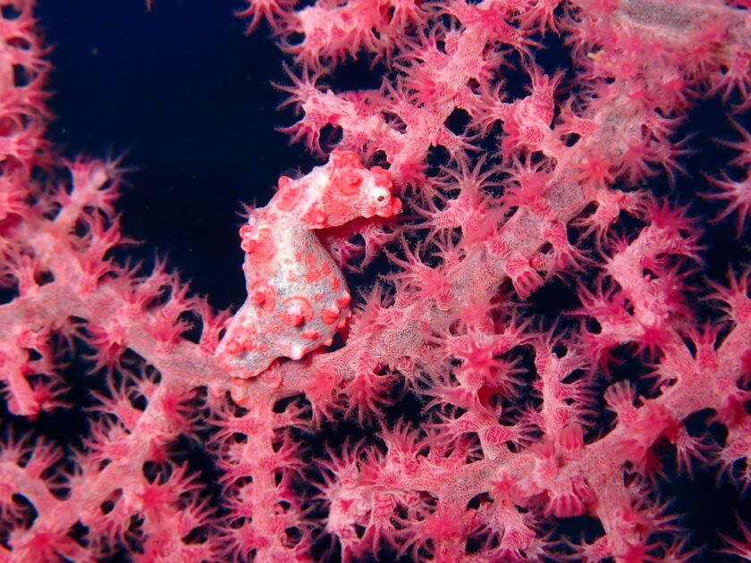 ウチワのポリプにそっくりすぎて、見つけてもカメラモニターを覗くと見失いそうになる(笑)。このピンク色がたまらなく可愛いぃぃ(⋈◍>◡<◍)。✧♡ヤギ(サンゴ)に擬態するタツノオトシゴの仲間で体長2cm弱という小ささ!背景と同じ色のコブを作って隠れる生物の摩訶不思議