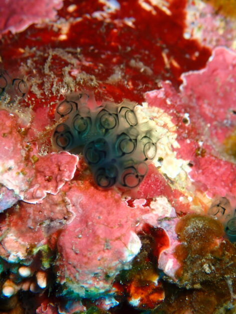 ダイバーの頭上をツムブリがビュンビュン回ってて、まるで天然の水族館。吸い込まれそうな透明度で最高に気持ちよかった〜! 岩肌にひっそり咲くワライボヤ