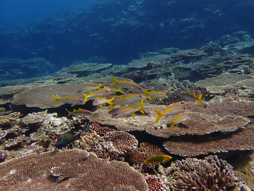黄色のラインが鮮やかなアカヒメジたちが極上サンゴの上でゆらゆらしてる姿は、南国ダイビングの醍醐味!どこを見てもお魚天国で幸せすぎる~♬