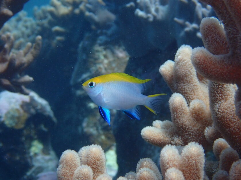サンゴの間で輝くブルーとイエローのコントラスト!