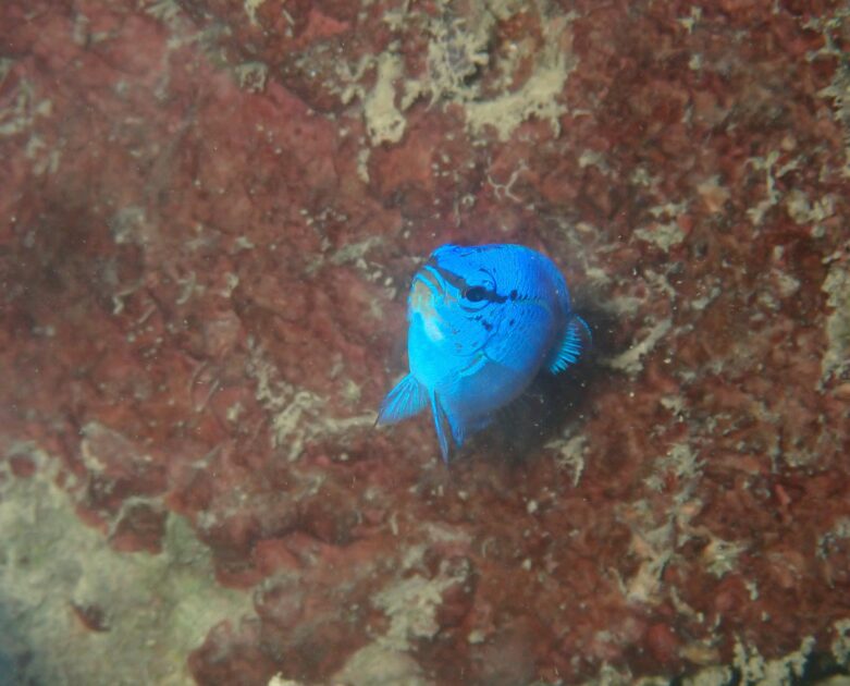 蛍光ブルーに黒いアイラインのルリスズメダイや