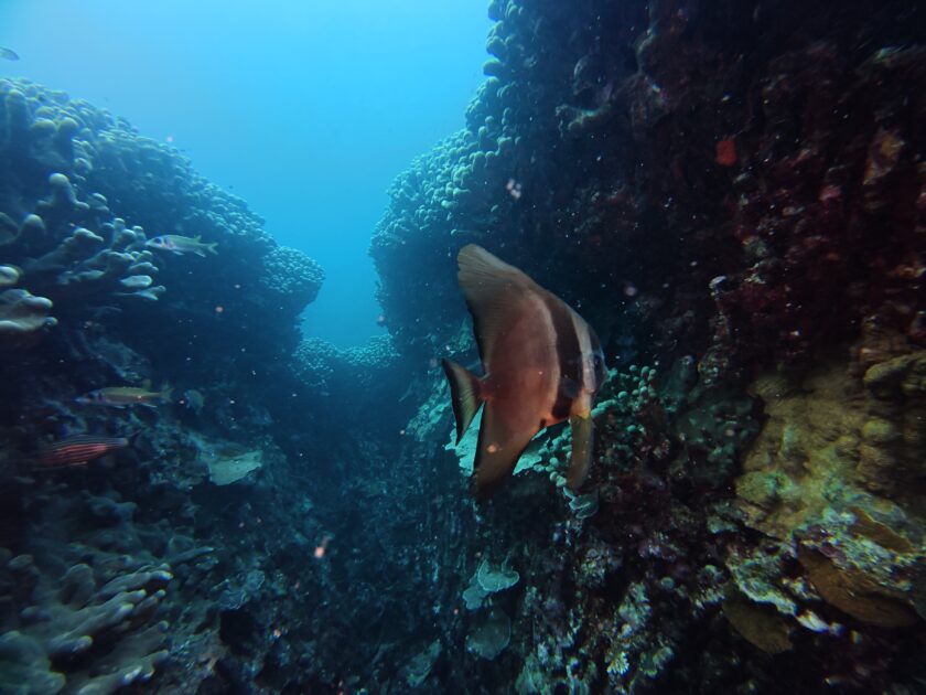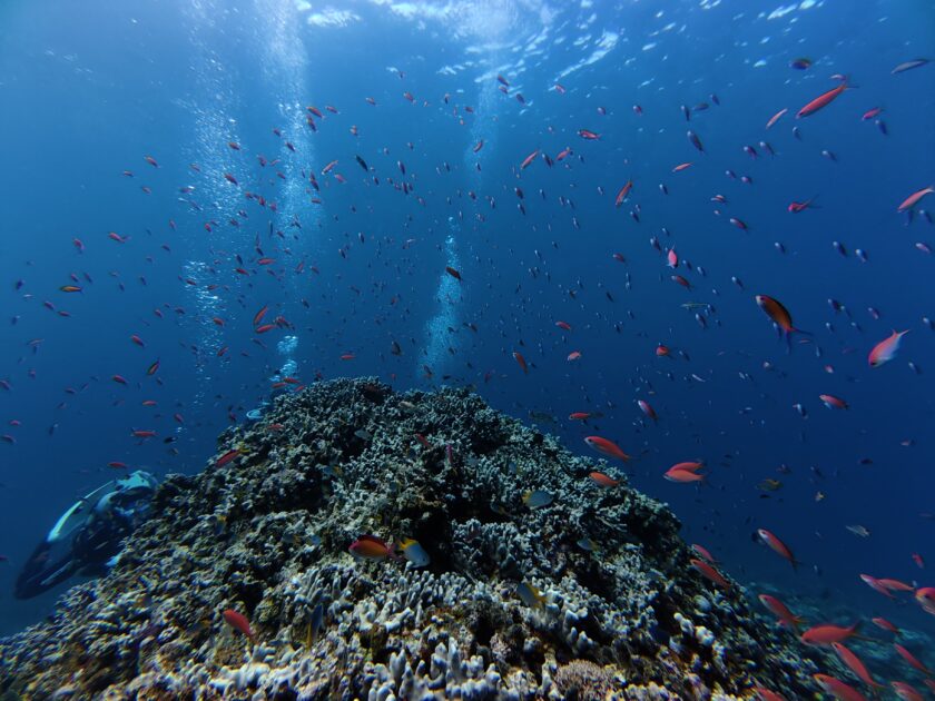 キンギョハナダイ&アカネハナゴイの楽園などなど 【川平石崎マンタシティ】透視度15~20m 今日は外したかなぁと船に戻ろうかなぁと思ったその時でした! 薄っすらとマンタらしき影が見えて近づいてみると