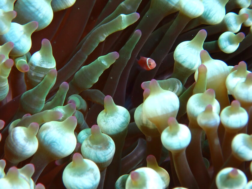 ゆらゆら揺れるイソギンチャクは、小さなクマノミにとって最高に安全な家。外敵から身を守りながら、こちらを伺う様子が本当に微笑ましいですね!