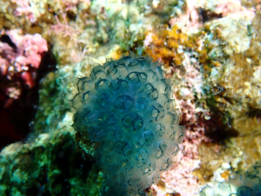 まるでみんなで新春の福笑いをしているみたい!水中の小さな芸術品はプルプルとした質感と透明なブルーが、とってもフォトジェニック!小さな命の輝きに癒やされてスケルトンな体の中に、複雑な構造が見えて興味深いですね! 【御神崎灯台南】透視度20m