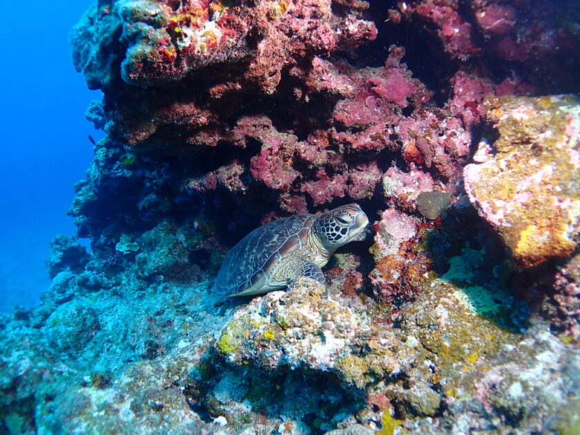 岩陰で休憩中のアオウミガメに遭遇