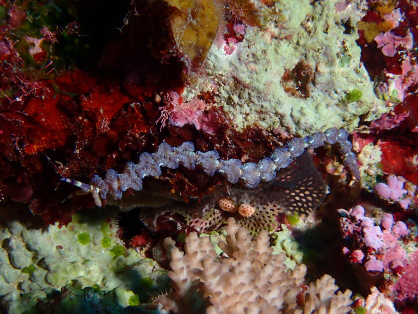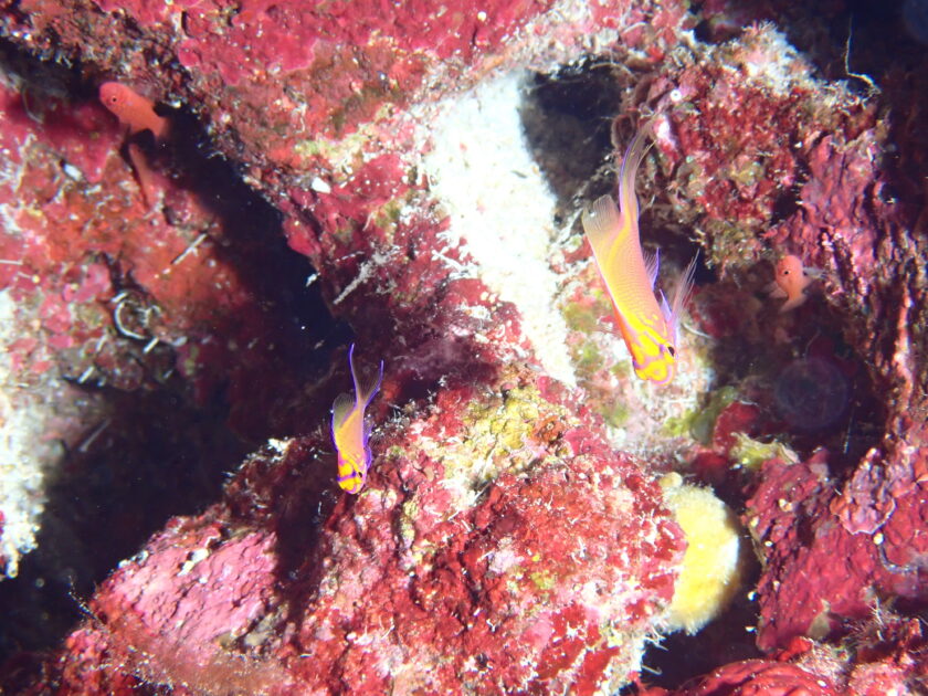 やや深場のドロップオフの岩陰にみを潜める幼魚たちは光が当たると、その紫がかったピンク色が鮮やかに発色し、サンゴ礁を華やかに彩ってくれます。