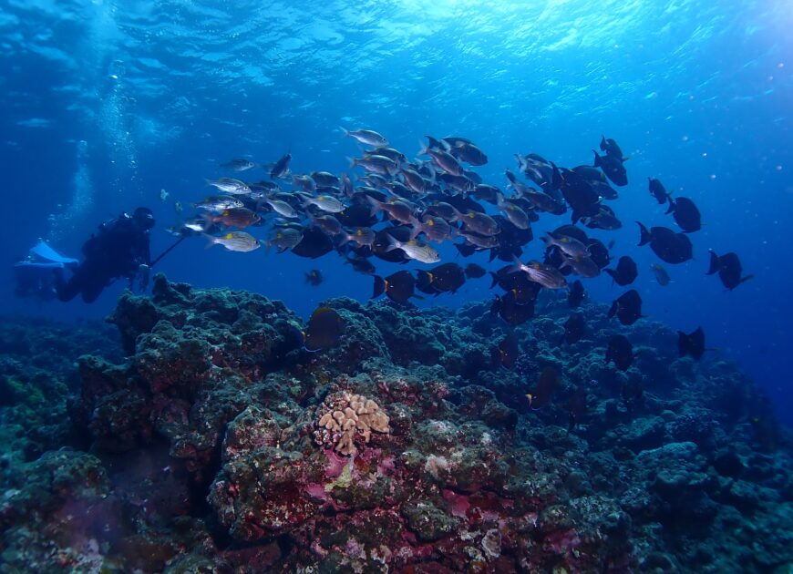 ノコギリダイやアカヒメジ、ニセカンランハギたちの群れに突っ込むのではなく、周囲をゆっくり泳ぐことで、自分も群れの一部になれますよぉダイバーを包み込むような大迫力のシーンは外敵から身を守るための知恵が、美しい流線型を描き出します!